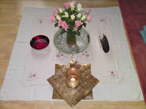 The first layer of this image shows three colours of plain Irises, on a pathway of question marks. This level represents the candidates and other Reiki Schools fragmented into their separate disciplines. The Purple Schools attuning to the Male aspect and only connecting to the Purple Ray of Amethyst. The Red Schools attuning to the Female aspect and only connecting to the Red Ray of Ruby. The White Iris represents the Radiance Technique people, seeking only to connect to vibrations of light.